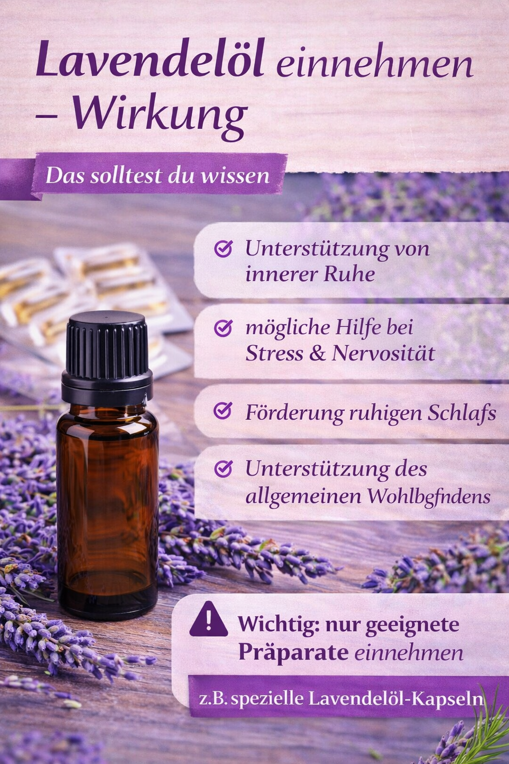 Lavendel wird häufig in der Aromatherapie, Naturkosmetik und als Heilpflanze verwendet. Die Pflanze bevorzugt sonnige Standorte und trockene, gut durchlässige Böden.